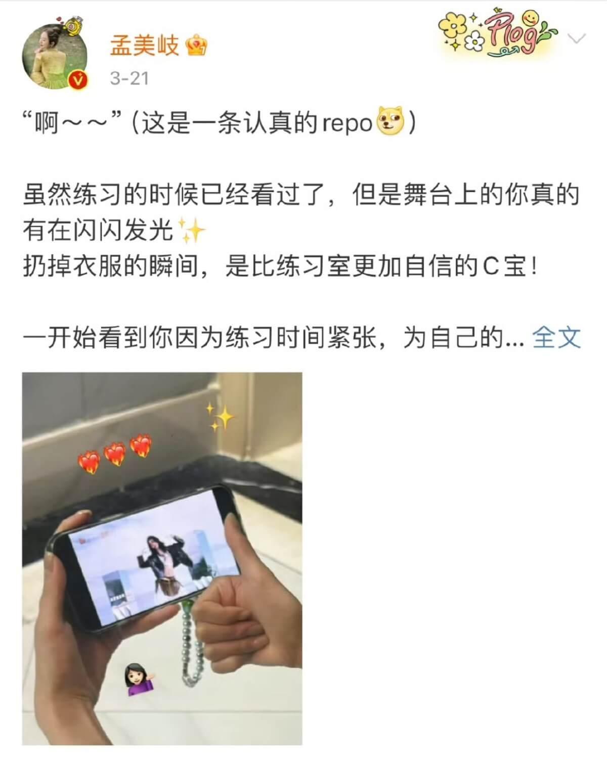 结果直播还没结束,孟美岐就上线发了浪姐有关的贴文,但却是在为宋妍霏打 call,因此就传出了两人不合之说。